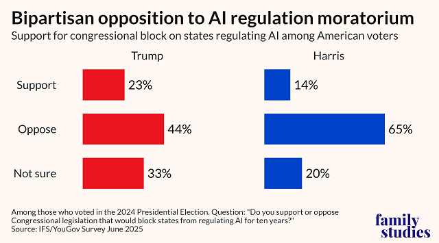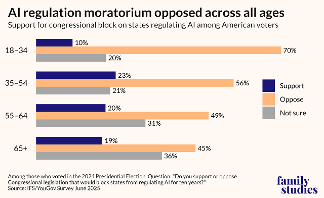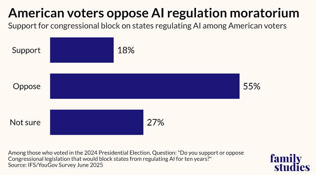 In a recent survey with YouGov, the Institute for Family Studies polled 763 Americans that voted in 2024 on whether they support the AI moratorium or not.1 This is what we found: