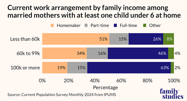Data from the federally funded 2024 Current Population Survey indicates that affluent married mothers with young children and a household income of at least $100,000 were significantly less likely to be homemakers than lower-income families earning less than $60,000 or middle-income families taking home $60,000-$99,000.