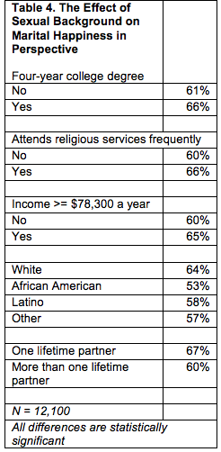 Consider how the difference in marital happiness based on lifetime sex partners stacks up against differences based on several of the usual social and demographic suspects.4 For a combined sample of men and women, spouses reporting only one lifetime sexual partner are 7% more likely to be happy than are those with other partners in their past.