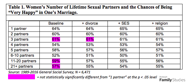 In sum, the surprisingly large number of Americans reporting one lifetime sex partner have the happiest marriages. Past one partner, it doesn’t make as much of a difference. The overall disparity isn’t huge, but neither is it trivial.