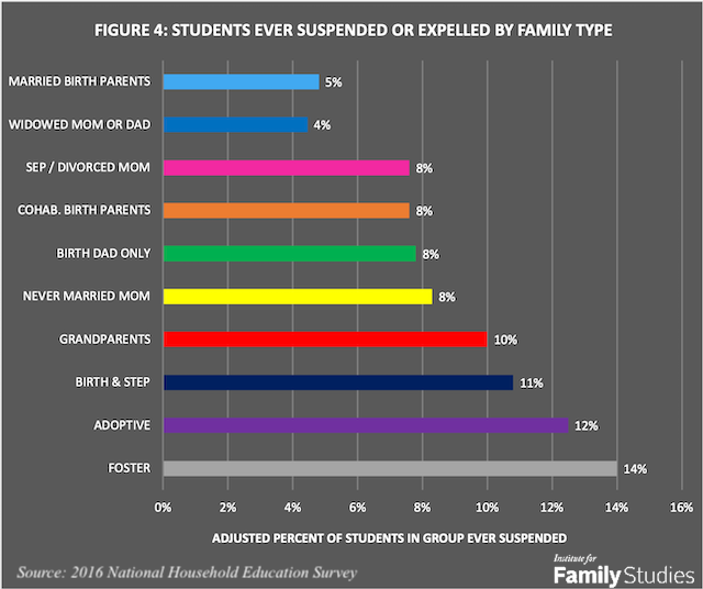 - Students in single-parent families and those with cohabiting birth parents had suspension rates that were one-and-a half-times higher than the rate for students with married birth parents. Post This