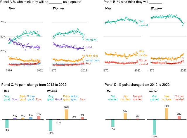 2. For example, in 2022, only 711 people answered whether they thought they’d get married, which in the chart gets divided into two sexes and three political ideologies each, with only 42 conservative women, a mere one of whom didn’t think she’d get married.