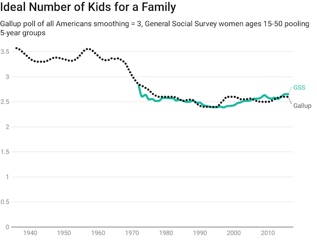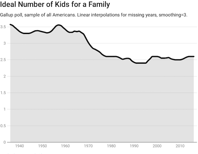 The trend shown by Gallup is pretty clear. The general ideal for childbearing was around 3.5 kids from the 1930s until the 1960s. In the early 1980s, it hit about 2.5 or 2.6 and has basically been stable since then.