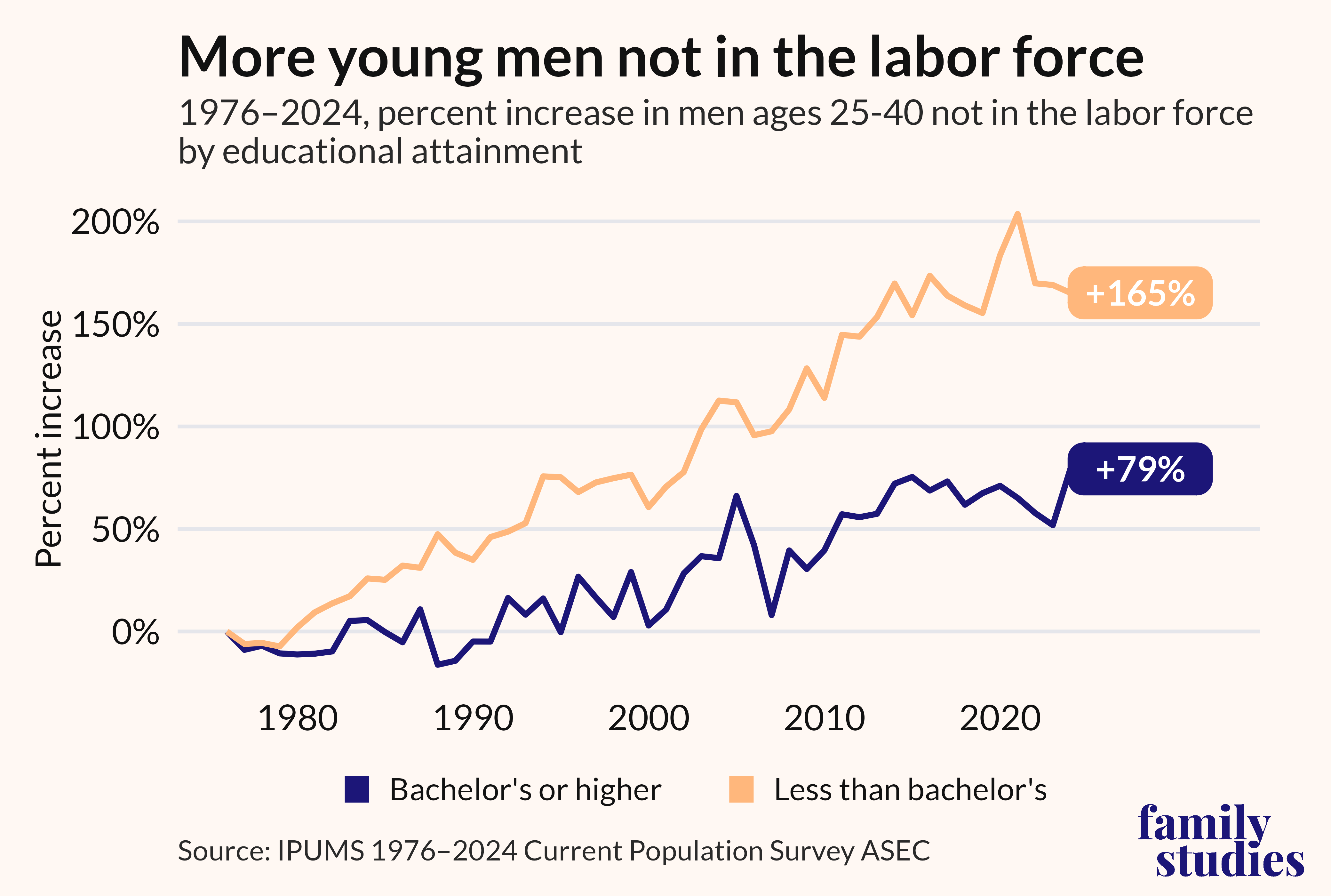 In the past fifty years, the share of men ages 25 to 40 who are not in the labor force—neither working nor looking for work—has more than doubled, rising from 5% to 11%. Men without college degrees have been hardest hit; over this time period, the share not in the labor force increased 165%, compared to a 79% increase among college educated young men. Family breakdown is not least among the reasons for this exit from work. Young men from non-intact families are 36% less likely to hold down a full-time job by the time they hit their mid-twenties.