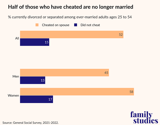 - Among ever-married, prime-age adults who have cheated on a spouse, about half are currently divorced or separated. Post This