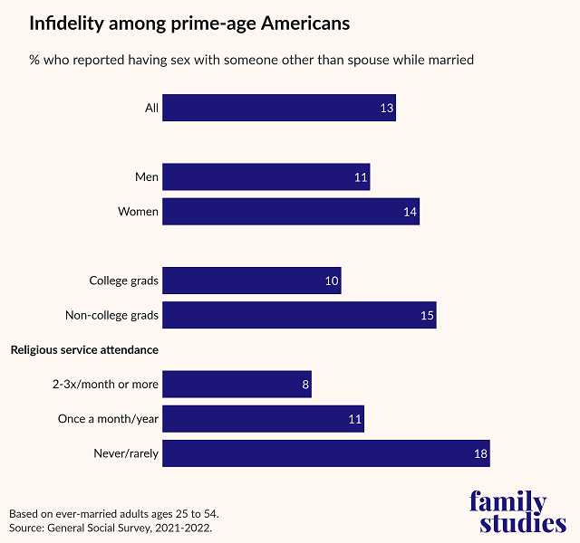 A few patterns remain consistent among prime-age, ever-married adults. Those with a college education are less likely than those without one to cheat (10% vs. 15%). Religious practice also plays a significant role in cheating: adults who regularly attend religious services are much less likely to have cheated than those who never or rarely attend (8% vs 18%).