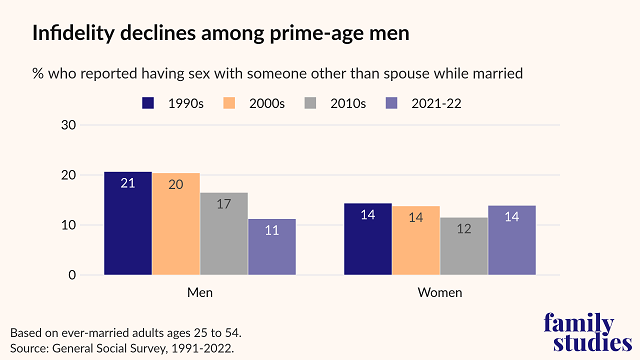 - In the 1990s and 2000s, about 1 in 5 ever-married men reported engaging in extramarital sex. That share fell to 17% in the previous decade and has continued to drop in recent years. Post This