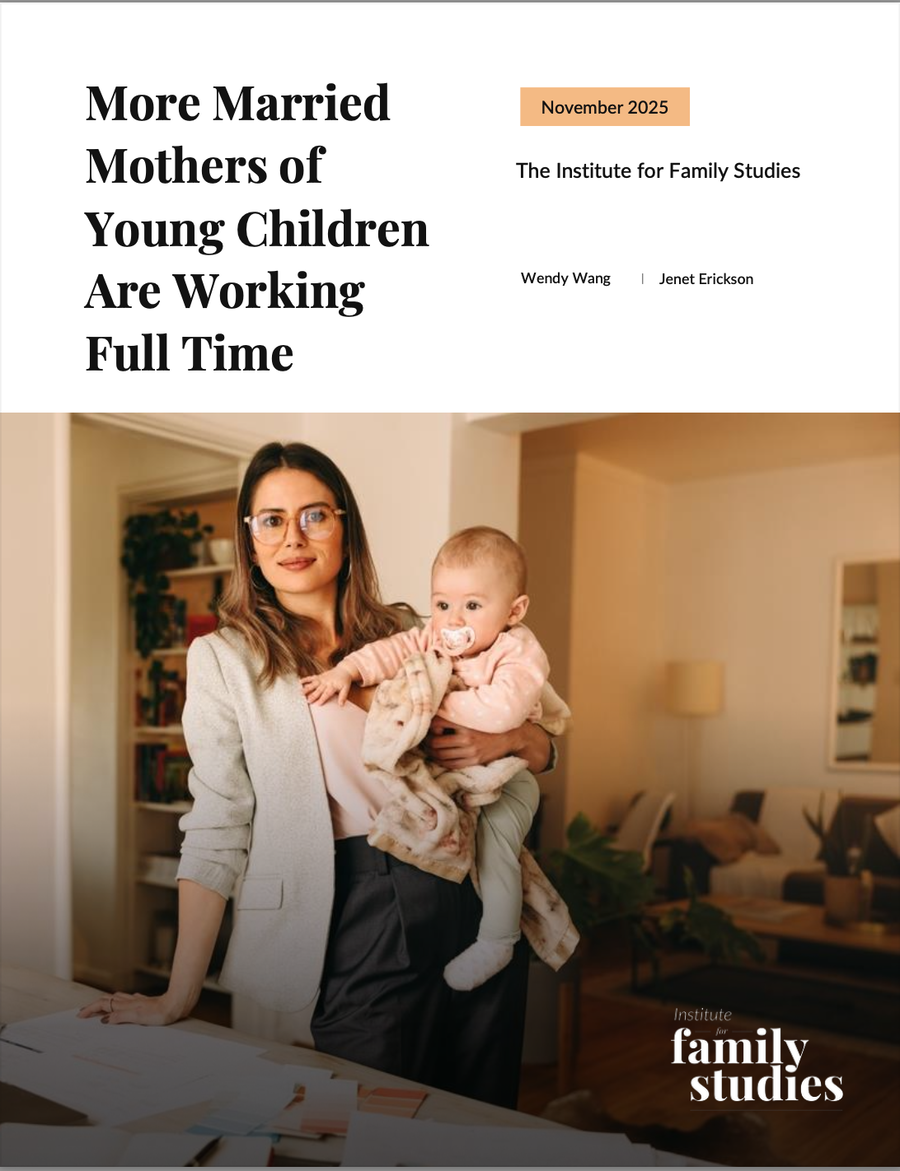 Even with the rise in full-time employment among mothers, full-time work is still not the preferred arrangement for married mothers with preschool-aged children. Only 39% of married mothers with children under age 5 at home say their ideal arrangement is to work full time, roughly equal to the 40% who prefer part-time work. An additional 20% say they prefer not to work for pay at all, according to a recent IFS/Wheatley Institute survey of 3,000 women ages 25 to 55. In fact, full-time employment is not the preferred arrangement of the majority of U.S. mothers. Overall, 47% of all mothers with children under age 18 prefer full-time work, 37% prefer part-time work, and the rest prefer not to work for pay at all.