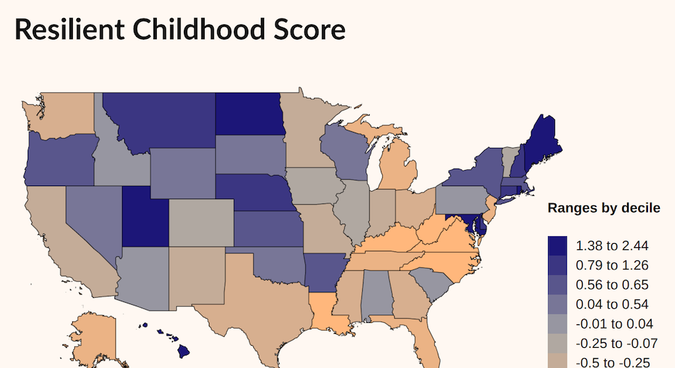 - The states with the top marks in our Resilient Childhood Score (i.e., where kids have the most diverse social lives and independent play, and use digital technology least) are Hawaii, Maine, Maryland, North Dakota, Rhode Island, and Utah. The states with the bottom scores are Kentucky, Louisiana, North Carolina, Virginia, and West Virginia.