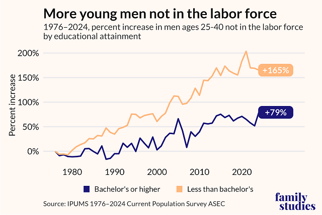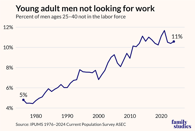 Finley is certainly right that we have a growing problem when it comes to young men’s connection to work. In 1976, just 5% of young men ages 25 to 40 were not in the labor force. That number has more than doubled, rising to 11% in 2024. Over the same period, the share of men in this age range not working full-time rose by 46%, such that now more than 1 in 5 men in this age group are not working full-time. In 2024, 3.8 million men ages 25 to 40 were not in the labor force, and a total of 7.8 million were not working full-time.