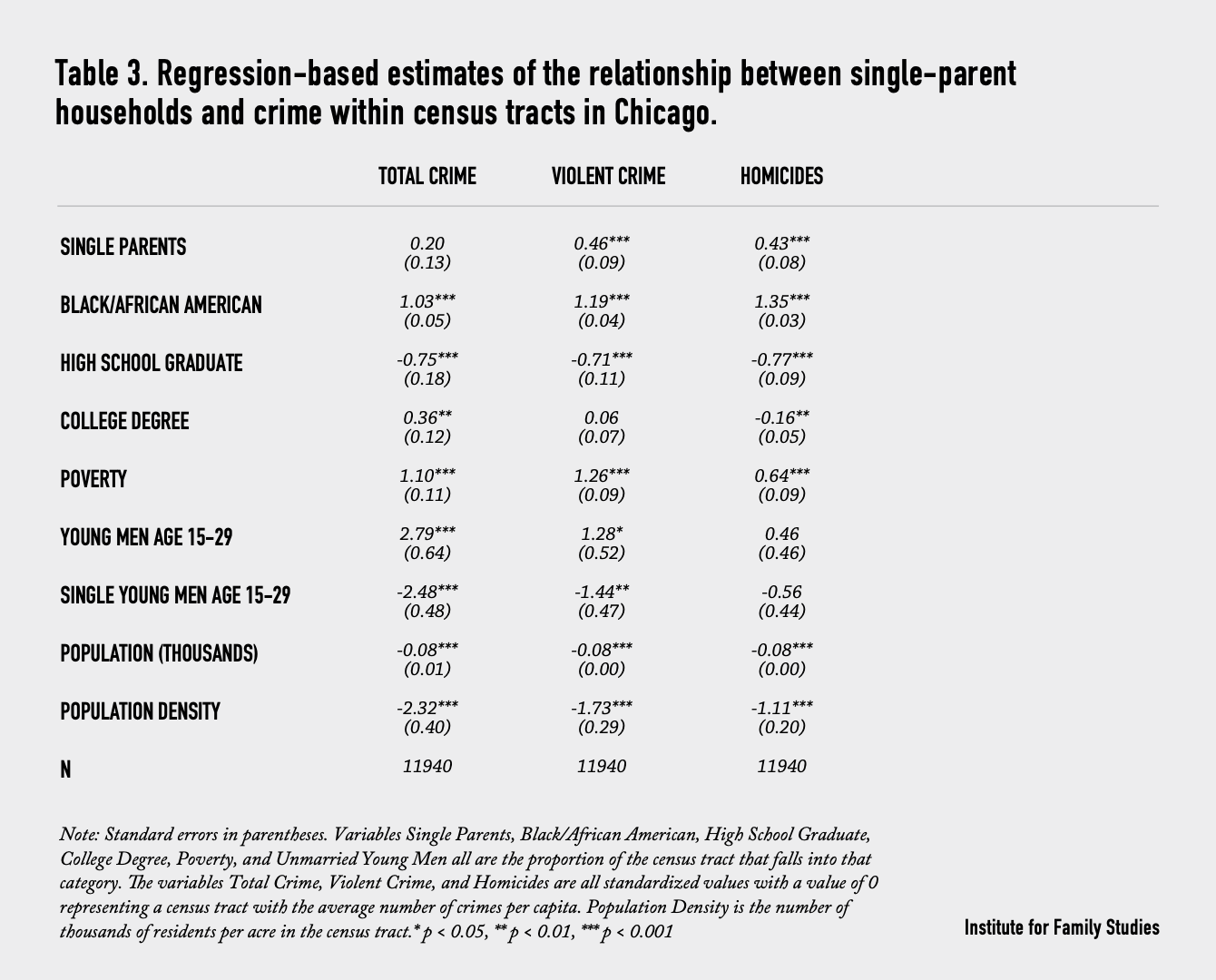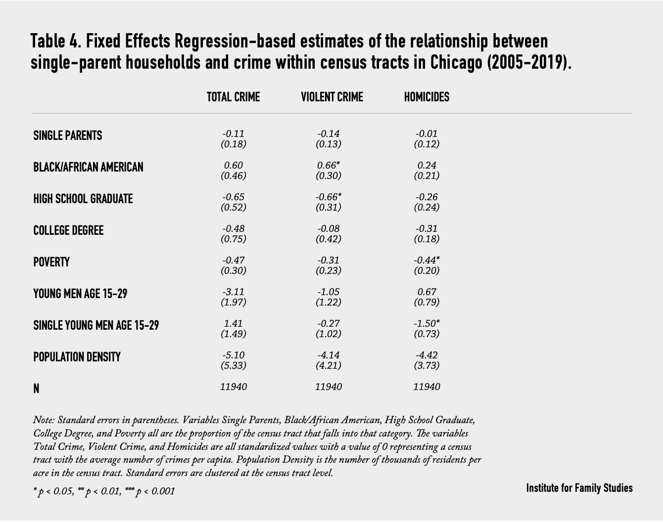To understand potential unobserved factors at the within-city level, we also conduct a separate analysis that zooms in on individual census tracts within Chicago. We examine the relationship between the fraction of single-parent households and violent crimes occurring in census tracts. Again, our key measure of family structure is the fraction of households headed by a single parent within the census tract. We include similar controls for the characteristics of the census tract (race, poverty, education, and age).