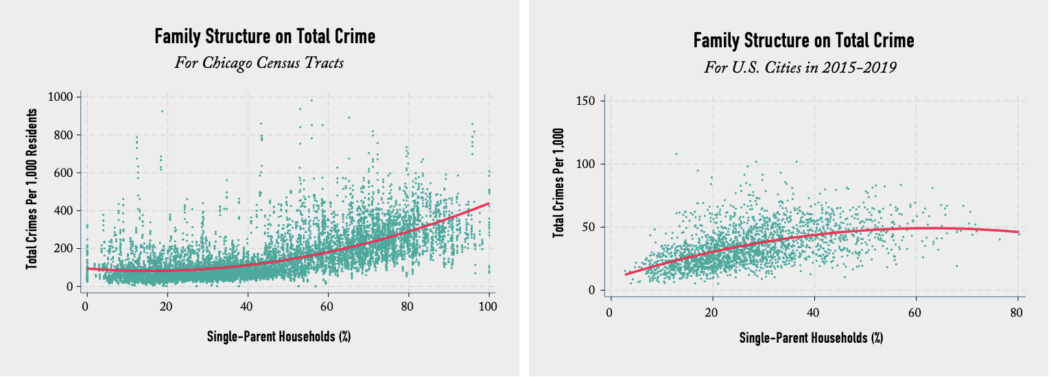We find that cities are safer when two-parent families are dominant and more crime-ridden when family instability is common. The same story applies to the neighborhoods of Chicago. More specifically, we find the total crime rate is about 48% higher in cities that have above the median share of single-parent families, compared to cities that have fewer single-parent families. That difference is even larger with respect to violent crime and homicide, specifically, with cities above the median level of single parenthood experiencing 118% higher rates of violent crime and 255% higher rates of homicide. In the Windy City, relying on an analysis of census tract level data, our research indicates that neighborhoods above the median fraction of single-parent-headed households experienced 137% higher total crime rates, 226% higher violent crime rates, and 436% higher homicide rates.