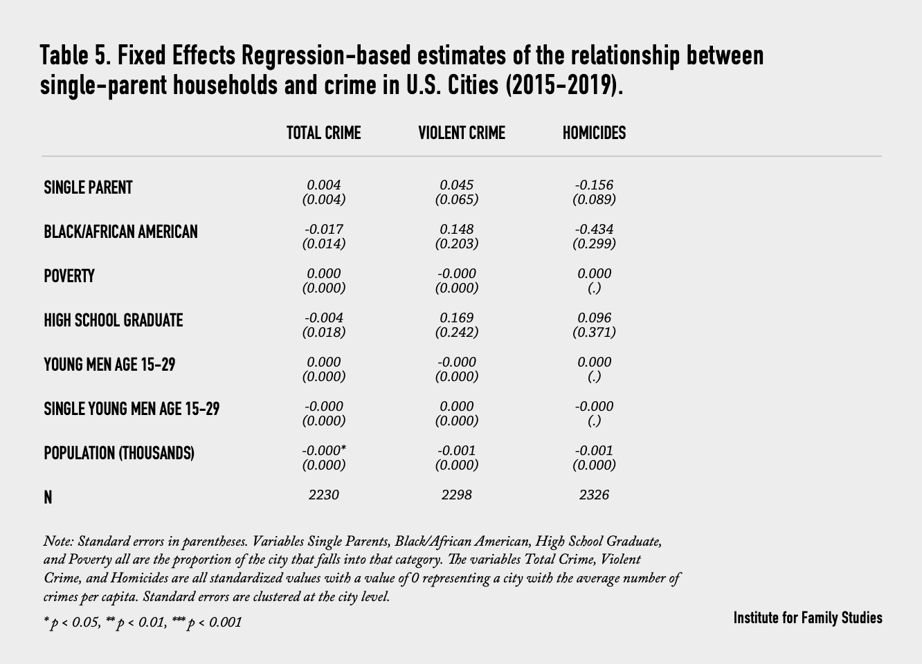 In Table 2, we find that a 100% increase in the proportion of single parents predicts that the total crime rate increases by 0.05 standard deviations. More intuitively, a 10% increase in the proportion of single parents results in a 0.005 standard deviation increase in total crime, and a 0.085 standard deviation increase in violent crime. These results are statistically significant with a p-value <0.01 or a confidence level of 99 percent. The estimated effect of our family structure measure on homicides is not statistically significant. The single-parent proportion of U.S. Cities from 2015 to 2019 ranges from 2% to 80 percent. If we look at the predicted effect of moving from the lowest proportion to the highest in cities across the United States, we expect to see a 0.039 standard deviation increase in total crime and a 0.663 standard deviation increase in violent crime.