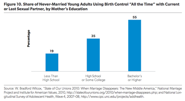 Sociologists Sharon Sassler and Amanda Miller interpret this dynamic somewhat differently: They argue that the stresses facing poor and working-class young adults leave them with a diminished sense of efficacy, which in turn makes it more difficult for them to navigate today’s choices related to sex, contraception, childbearing, and marriage than their better-educated and more affluent peers.23 But the bottom line is similar: Today’s ethos of freedom and choice when it comes to dating, childbearing, and marriage is more difficult for working-class and poor Americans to navigate. For instance, young adults from less-educated homes are less likely to consistently use contraception than are young adults from more educated homes, as Figure 10 indicates.