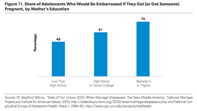 Figure 11 is illustrative, for instance, of the ways in which norms against teenage childbearing are weaker in poor and working-class communities than they are in middle- and upper-class communities. It shows that adolescents from more educated and affluent homes are more likely to report they would be embarrassed by a teenage pregnancy than are their peers from less-educated homes. This figure is indicative of the ways in which class norms, ideals, and expectations are more marriage-friendly in the middle and upper class.