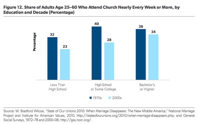 Finally, the civic fabric of America has frayed since the 1960s in ways that have disparately affected poor and working-class Americans—and their families. Membership and involvement in secular and religious organizations have declined across the board, but they have fallen more precipitously among poor and working-class Americans.32 This matters because such organizations have tended to support families over the years. This is particularly true for religious institutions, which often offer psychic, social, and moral support to marriage and family life. Indeed, Americans who regularly attend religious service are more likely to marry, have children in wedlock, avoid divorce, and enjoy higher-quality relationships.33 Nevertheless, as Figure 12 indicates, religious attendance has fallen most among Americans with less education.