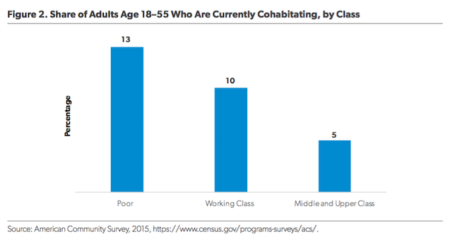 When it comes to coupling, poor and working-class Americans are more likely to substitute cohabitation for marriage. Figure 2 shows that poor Americans are almost three times more likely to cohabit, and working-class Americans are twice as likely to cohabit, compared with their middle- and upper-class peers age 18–55.