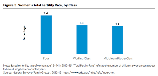However, when it comes to another fundamental feature of family life—childbearing—working-class and especially poor women are more likely to have children than their middle- and upper-class peers (see Figure 3). Estimates derived from the 2013–15 National Survey of Family Growth indicate that poor women currently have about 2.4 children, compared with 1.8 children for working-class women, and 1.7 children for middle- and upper-class women. Poor women, in particular, start childbearing earlier and end up having markedly more children than more affluent women.