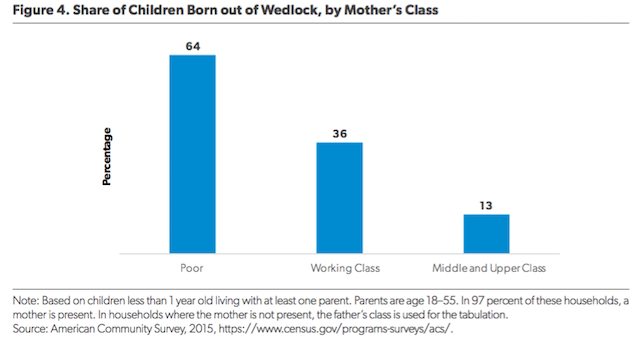 But the fact that working-class and poor Americans are less likely to be married also means they are more likely to have these children outside of wedlock. In fact, as Figure 4 indicates, children born to working-class mothers are almost three times as likely to be born outside of wedlock, compared with children born to middle- and upper-class mothers. Children born to poor mothers are about five times as likely to be born out of wedlock.