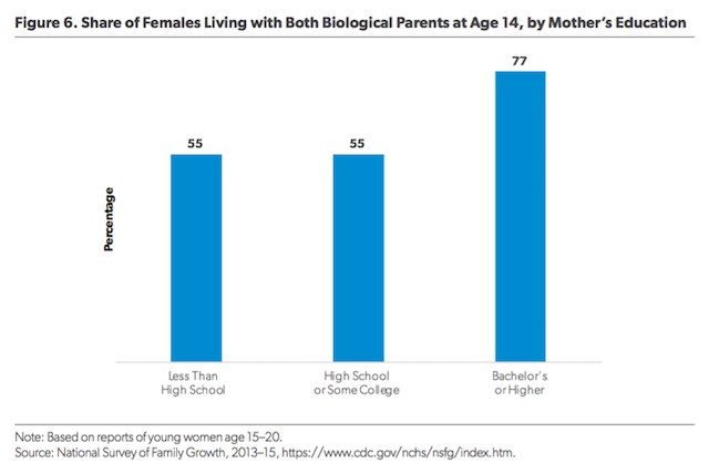 High rates of nonmarital childbearing and divorce among working-class and poor adults translate into more family instability and single parenthood for children in working-class and poor communities. Figure 6 indicates the vast majority of middle- and upper-class teenage girls grew up in an intact home headed by two biological parents, whereas 55 percent of working-class girls lived in such a home at age 14, as did 55 percent of poor girls.5 The bottom line: The greater fragility of marriage and family life in poor and working-class families means that fewer children in such homes live with two biological parents. Children are more likely to thrive educationally, socially, and professionally when they are raised by married, biological parents, compared with being raised by a single parent or a stepfamily.6