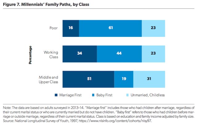 Two points are particularly salient here. First, nonmarital childbearing is comparatively rare among more affluent and educated women. Second, it is still the case that a majority of babies born to working-class mothers are born in wedlock. In other words, marriage is still connected to parenthood for most working-class parents having a baby.