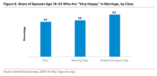 Family structure is an important predictor of the economic, social, and psychological well-being of adults and children.8 But the relationship quality of marriages also matters, both for adult outcomes and children’s outcomes.9 Is there also a class divide in marital quality? As Figure 8 indicates, there is indeed a difference in marital quality by class, but this difference is not as striking as most of the demographic differences previously noted. On the other hand, the share of working-class and poor Americans who are married is markedly lower, which means they are a more selective group.