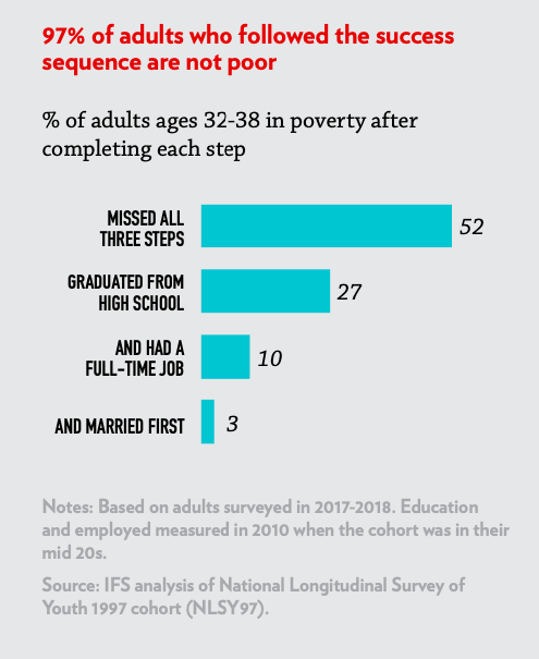 Critics of the success sequence often point out that it ignores the “obstacles individual efforts can’t always overcome.”There is no question that structural disadvantages make it more difficult to follow the three steps of the sequence. But that is also why it matters: Young adults who manage to follow the sequence— even in the face of disadvantages—are much more likely to forge a path to a better life.