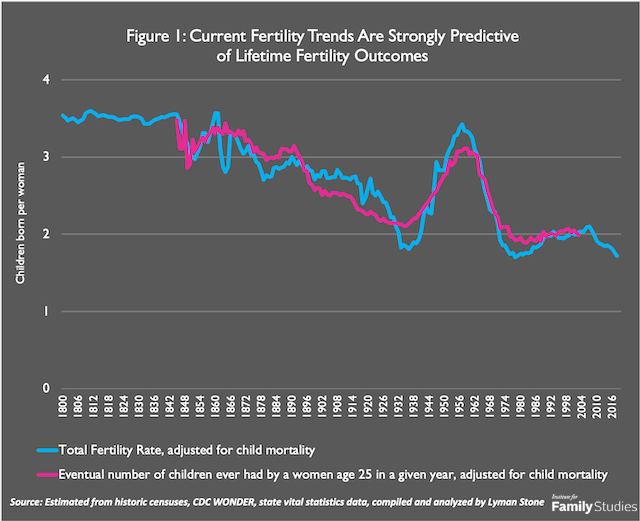 This rise in childlessness hasn’t showed up yet in the headline data used to measure ultimate family size, and so much of the public commentary on the question remains fairly blithe and unconcerned. Major research organizations like Pew continue to point to the fact that women in their forties have had relatively high “completed fertility,” which is a term for how many children they have ever had. In a recent article in Rolling Stone, sociologist Philip Cohen is even quoted as saying “we shouldn’t care that much” about declining births. However, there is reason for concern. Figure 1 below shows the long-run history of fertility in America, both in terms of the current total fertility rate (a naïve extrapolation of how many children women will have if birth rates in that year are stable over time) and also how many children women who were 25 in that year ended up actually having by the time they were 50.