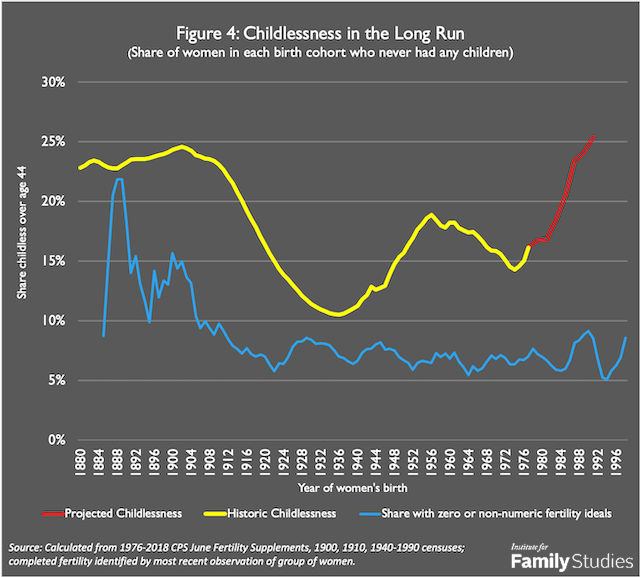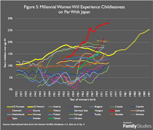 But it gets worse: childless rates will reach extraordinary levels in international comparison. American women born in the 1990s will probably be as likely to be childless as Japanese women who were born in the 1970s, the women whose low birth rates gave rise to the advent of modern concerns about “ultra-low fertility” of demographic trends.