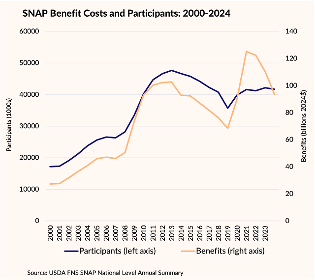 SNAP is the nation’s primary food assistance program for low-income households, providing nearly $100 billion annually in benefits—making it the largest safety net program after Medicaid. Participants receive monthly benefits through a debit-like card to help them purchase groceries. As shown in the figure below, instead of stabilizing, SNAP has grown substantially in both participation and costs in recent years. Even after adjusting for population growth, my estimates show that the share of the population receiving benefits has nearly doubled over the past two decades, increasing from about 6% in 2000 to roughly 12% by 2019 when the unemployment rate was at historic lows.