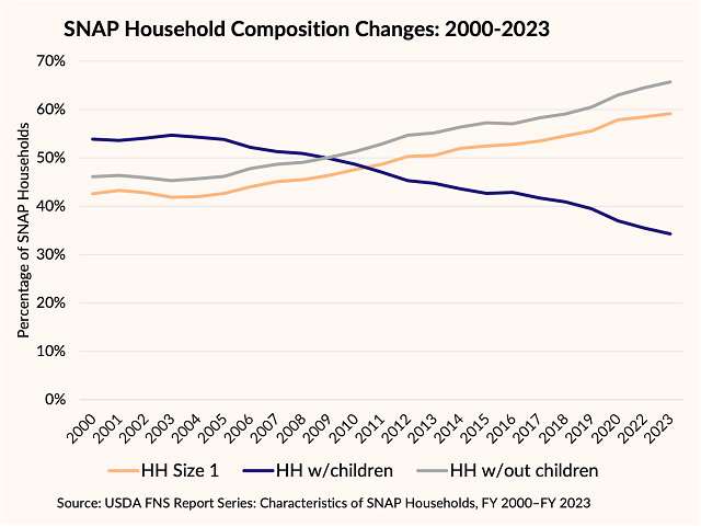 This overall growth masks profound shifts in the composition of SNAP households. As the figure below shows, the program has moved away from primarily serving families with children toward serving households without children, particularly those consisting of just one person. In FY 2000, a majority (53.9%) of SNAP households included children, and 42.6% of all SNAP households involved one person. By contrast, in FY 2023, only 34.3% of SNAP households included children—with a record 65.7% having no children—and 59.2% were single-person households.