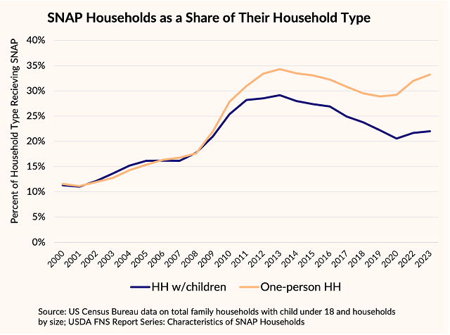 Until around 2009, households with children and single-person households participated in SNAP at roughly the same rate—about 21% and 22%, respectively (see figure below).1 After 2009, however, the trends diverged. By FY 2023, participation among single-person households had risen to 33%, while participation among households with children remained essentially unchanged (22%). While differences between SNAP administrative data and Census household data account for some of this divergence, the broader pattern is clear: SNAP participation is increasingly concentrated among childless and especially single-person households.