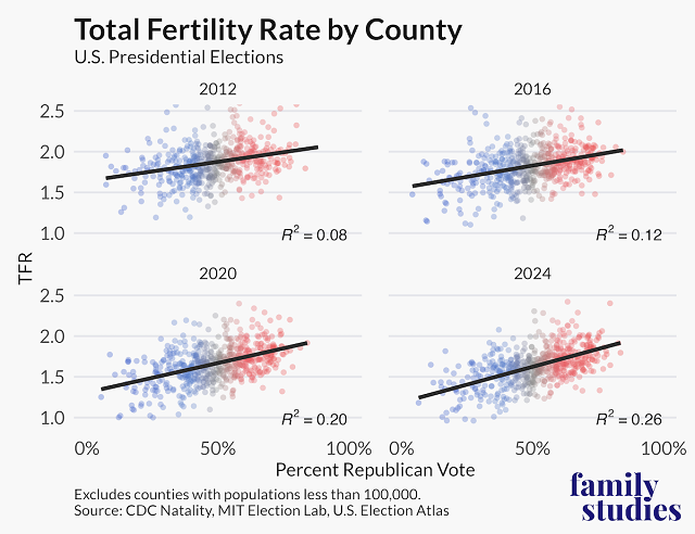 Not only is the fertility gap between very-Republican and very-Democratic places widening, but it seems like fertility behavior is increasingly well-predicted by partisanship. Whereas in 2012 just 8% of the variance in fertility between counties was accounted for by vote share, that number has grown to 26% by 2024. Over a quarter of the variance in county fertility rates can be accounted for by political partisanship. Essentially, the parties are divided by family.