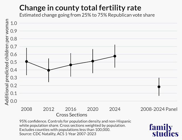 Finally, Patrick T. Brown noted in an earlier IFS blog post that Republican counties do not significantly differ from Democratic counties in the proportion of babies born to married parents, contrary to years past. So, while Republican counties have higher fertility rates, these babies are not necessarily being born into more stable families.