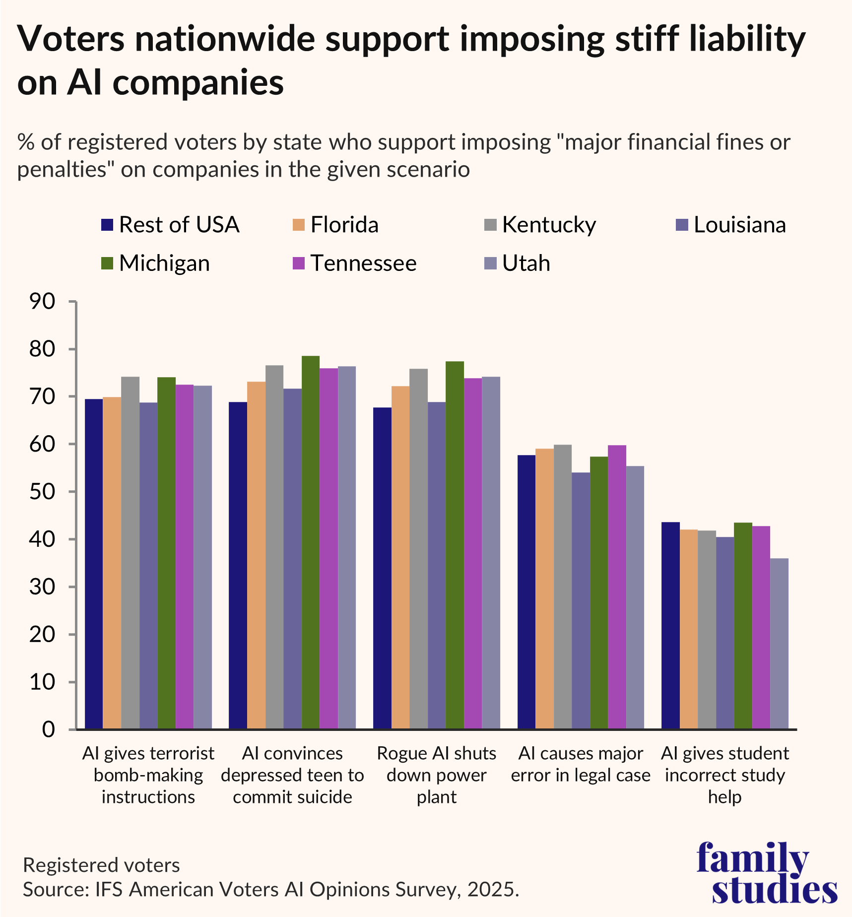Voters in 6 key states—Florida, Kentucky, Louisiana, Tennessee, and Utah (Red), and Michigan (Purple)—as well as across the U.S. strongly support holding AI companies liable for harms caused by AI systems.