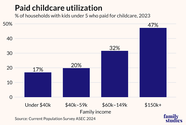In fact, just 27% of kids ages 5 and under are enrolled in paid child care, according to the 2024 Current Population Survey’s Annual Social and Economic Supplement (CPS ASEC). These kids disproportionately come from middle- or upper-class families, with highly educated parents, and are living in some of the most educated and advantaged areas of the country—places like Cambridge, Massachusetts; Ann Arbor, Michigan; and Washington, D.C. The average income of families utilizing paid child care in the U.S. is nearly $180,000.