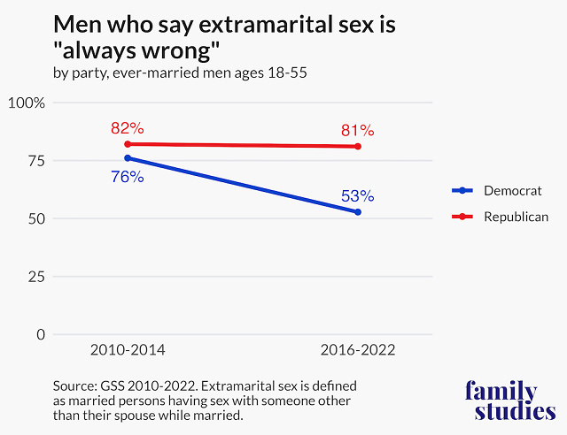 But not all groups of men are the same. Contrary to what the headlines might suggest, Republican men are less likely to stray than other men. That might be partly because, when it comes to attitudes about cheating, it’s actually Democrats who have become more accepting of extra-marital sex in recent years. This trend has been especially pronounced among Democrats since what Matt Yglesias called the “Great Awokening” (circa 2014), when many Democrats lurched hard to the cultural Left.