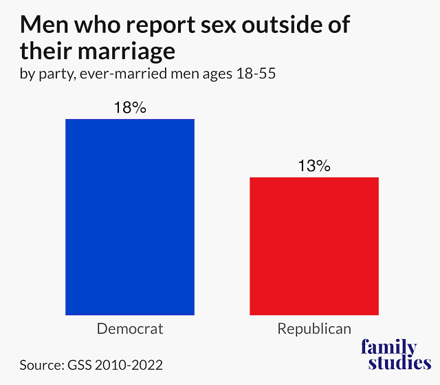 More importantly, when it comes to behavior, Republican ever-married men are less likely to report having strayed. In fact, 18% of Democratic ever-married men (18-55) report having ever had sex outside of marriage, compared to 13% of Republican ever-married men, according to the GSS. In other words, Democratic husbands are more likely to indicate they have had extramarital sex than Republican husbands.