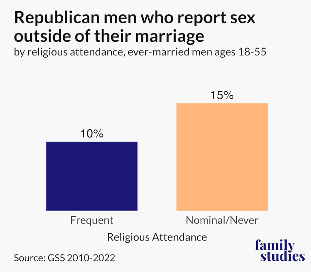 Beliefs and actions do not always track. But they often tend to, and this holds true when it comes to marital infidelity. Not only do nominal or nonreligious Republicans disapprove of infidelity at lower rates, but they also engage in it more often. The GSS indicates that secular Republicans engage in extramarital sex at higher rates, with 15% reporting extramarital sex compared to 10% from their religious peers. In this way, secular Republican ever-married men are more like their Democratic peers, both religious and nonreligious.