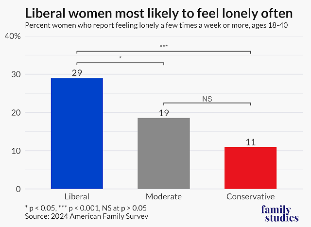 Third, lower levels of marriage and churchgoing among liberal women may also have a hand in their elevated reports of loneliness, which, in turn, diminishes their odds of being happy.