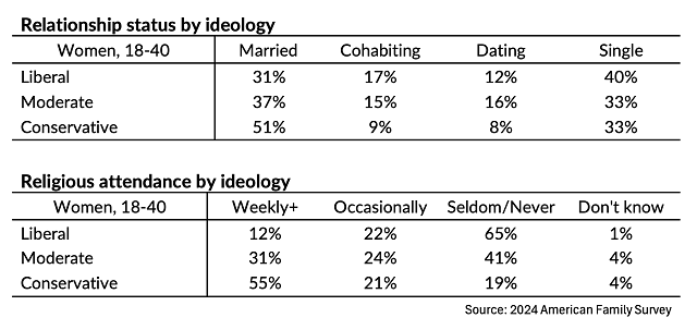 Our results from the American Family Survey are striking. Conservative women ages 18-40 are married at rates that are 20 percentage points than liberal women in the same age group. And whereas over half of conservative women in this age group attend church weekly, only 12% of their liberal peers do. Together, these two factors account for about half the ideological gap among young women in a multivariate analysis of life satisfaction that included controls for factors like race, education, and income.